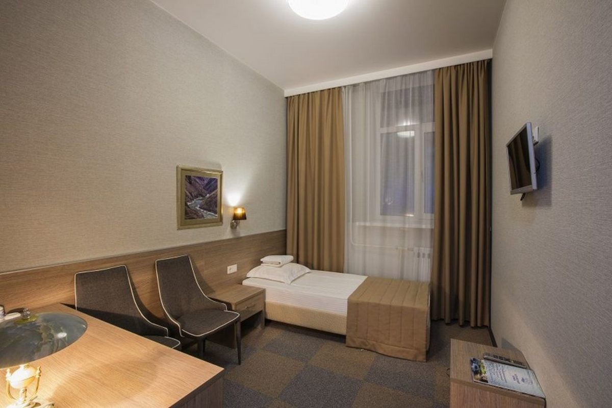 Оснащение номера: односпальная кровать, прикроватная тумбочки, стол, стулья, шкаф для одежды, набор посуды, телевизор, телефон, холодильник, электрический чайник