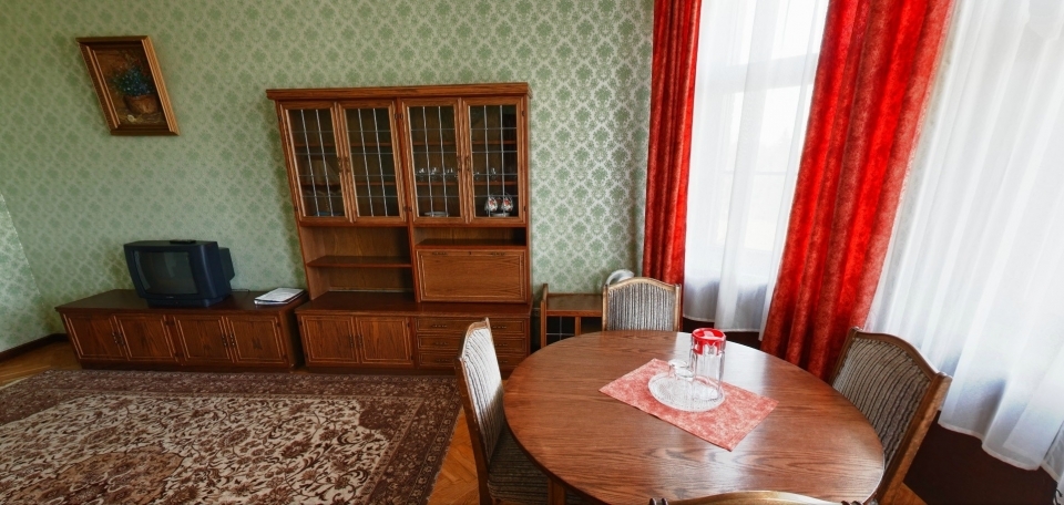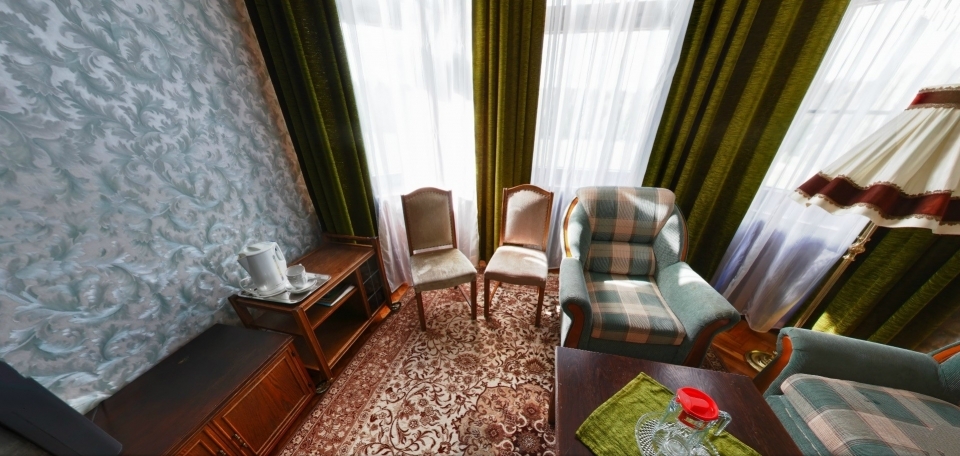 В номере: Кресло, диван, 2 кровати, торшер, шкаф, холодильник, телевизор, телефон, электрочайник.